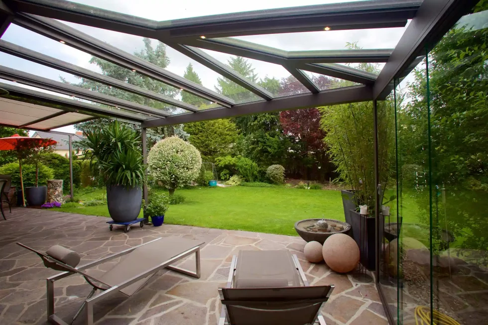 - Bei unseren Flachdach-Lounges sind Ganzglasecken möglich und dank des integrierten Beschattungssystems verschwinden Raffstore und Zip-Screens unsichtbar in der Rinne.